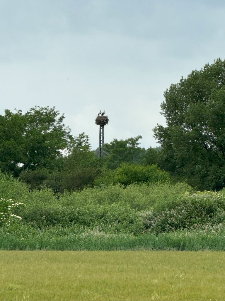 We went for a bike ride last Thursday, German Father’s Day, and came across this stork’s nest out in the middle of a field. These nests are not uncommon here, but this one looked especially lovely nestled in the greenery of the field and bushes.